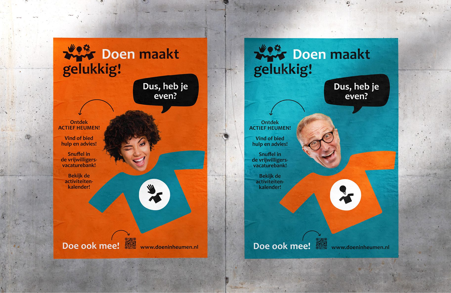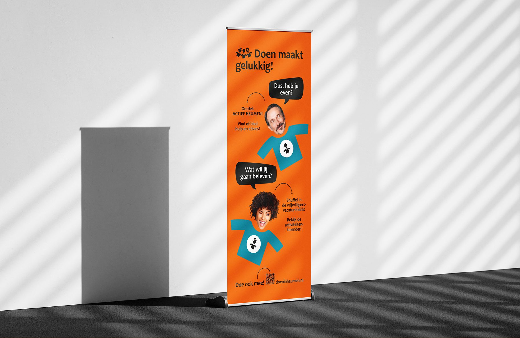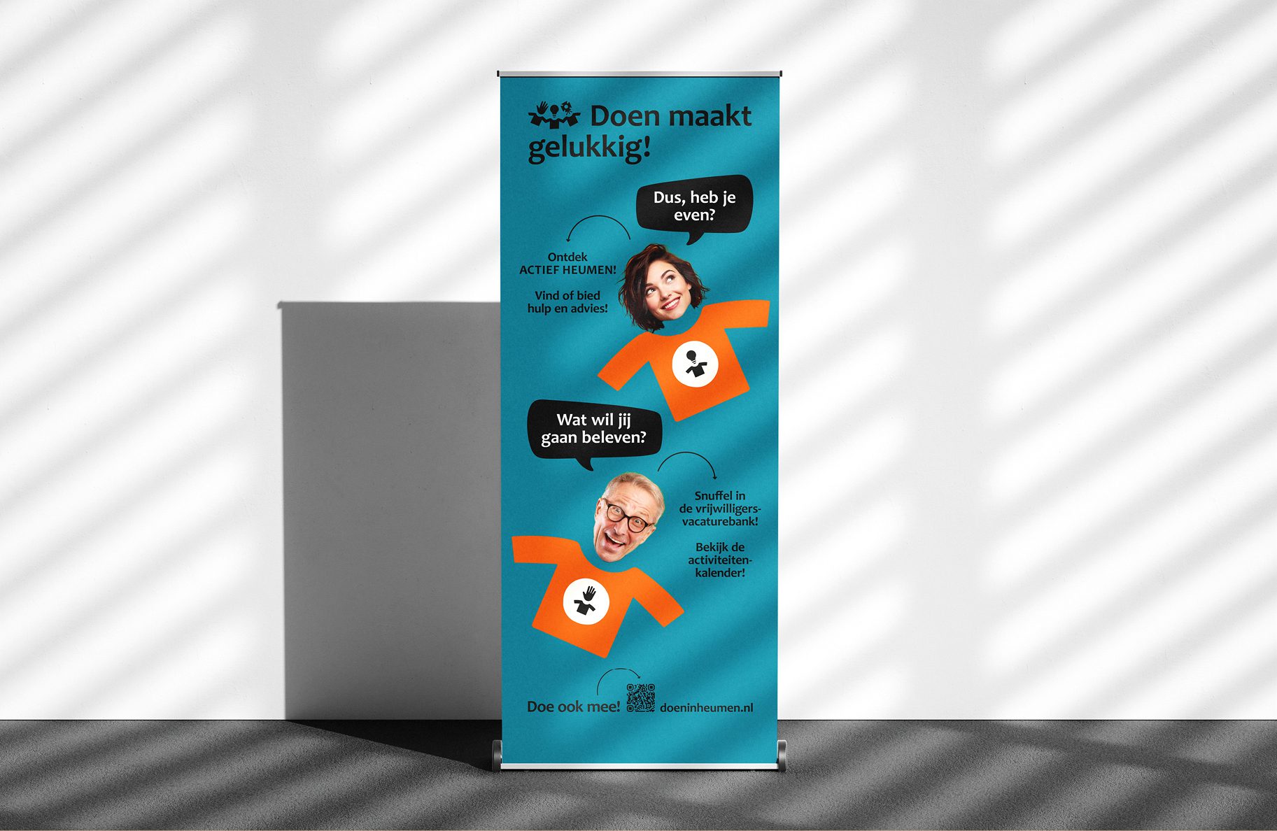 Voor vrijwilligerssteunpunt Heumen maakten we een roll up banner en posters op diverse A-formaten. Het doel was mensen attent te maken op de mogelijkheden via de website ‘Doen in Heumen’ en een brede doelgroep te motiveren vrijwilligerswerk te gaan doen. Het idee was om foto’s van bekende Heumenaren te gebruiken; herkenbaar voor mensen uit de buurt.